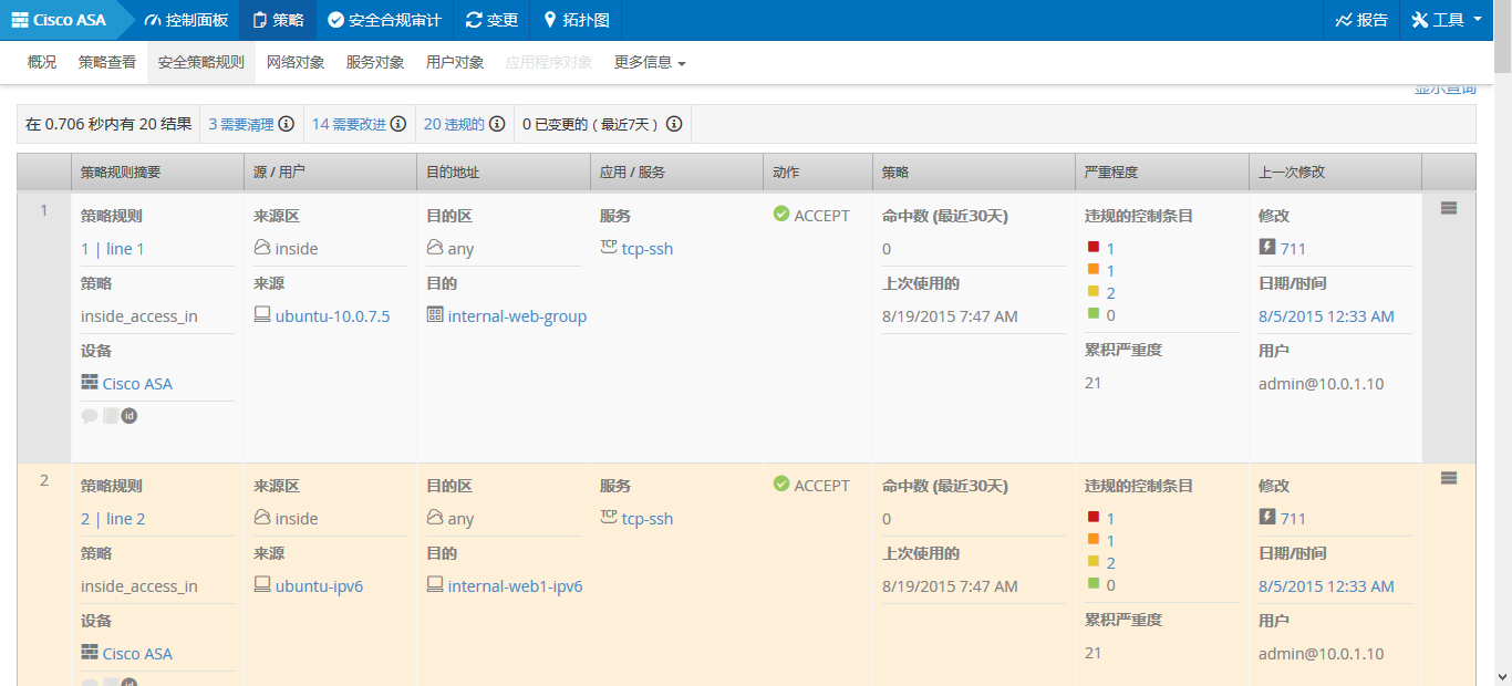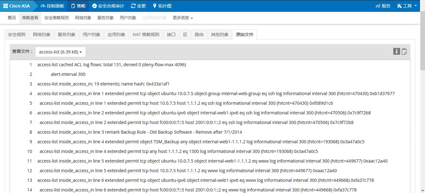 管理員可利用Firemon 產(chǎn)品查看被管理設(shè)備的配置、配置變更記錄,包括變更記錄的詳細(xì)信息,何時(shí)、何地、何人、做了怎樣的變更,并且可比較不同時(shí)間點(diǎn)的配置的異同,并詳細(xì)標(biāo)記差異之處,使得管理員清楚地了解配置的變化,以及變化的過程。