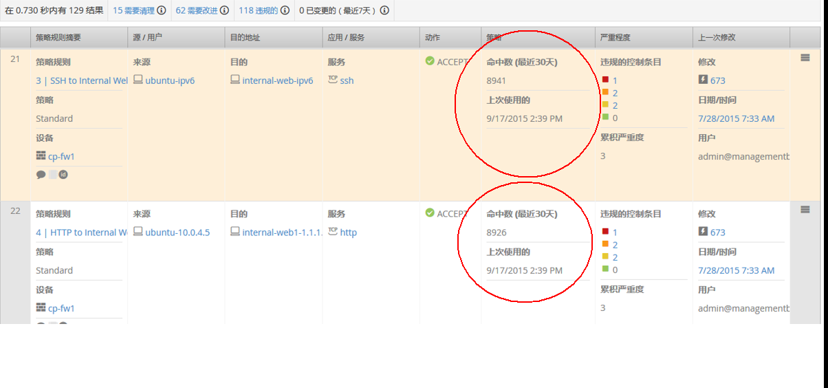 FireMon 產(chǎn)品記錄每條安全策略的被使用情況,并且通過圖形化方式顯示策略利用率報(bào)告。通過這個(gè)報(bào)告,你可以查看某臺(tái)防火墻上安全策略的利用率狀況,或者哪些策略是長(zhǎng)期以來(lái)沒有被使用過。管理員通過該報(bào)告可以調(diào)整防火墻安全策略的順序,或者刪除長(zhǎng)期命中率為零的安全策略。