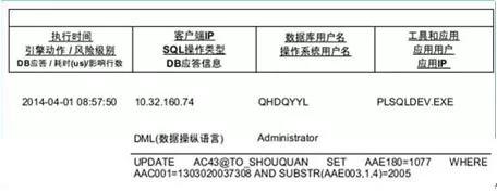 三代數(shù)據(jù)庫安全審計產(chǎn)品的關鍵就是,如何通過業(yè)務化的語言呈現(xiàn)出對數(shù)據(jù)庫的訪問行為;將傳統(tǒng)數(shù)據(jù)庫中的要素客戶端IP、數(shù)據(jù)庫用戶、SQL 操作類型、數(shù)據(jù)庫表名稱、列名稱、過濾條件變成業(yè)務人員熟悉的要素:辦公地點、工作人員名稱、業(yè)務操作、業(yè)務對象、業(yè)務元素、某種類別的業(yè)務信息。為了更清楚的說名這個問題,我們對比看看三代演進前后數(shù)據(jù)庫安全的審計記錄: