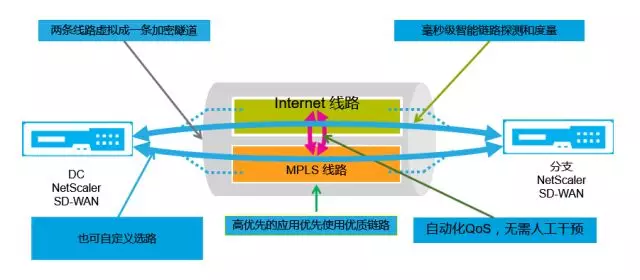 1、SD-WAN將Virtual WAN與傳統(tǒng)WAN結(jié)合,在這之上做overlay;同時能夠在多種連接之間動態(tài)選擇鏈路,將用戶流量進行區(qū)分傳輸,對企業(yè)實時性要求極高的應(yīng)用(例如VoIP,視頻會議,流媒體,虛擬應(yīng)用和虛擬桌面等)采用低延時專線傳輸,而多數(shù)應(yīng)用流量將通過WAN優(yōu)化后的互聯(lián)網(wǎng)傳輸,以達到負載均衡或者資源彈性。