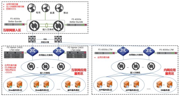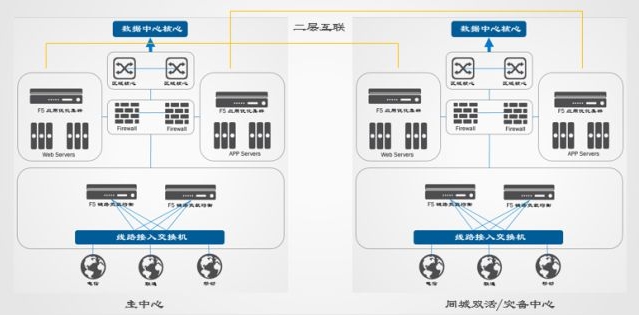 通過F5專業(yè)應(yīng)用交付設(shè)備協(xié)助客戶搭建災(zāi)備數(shù)據(jù)中心。雙中心互聯(lián)網(wǎng)接入?yún)^(qū)部署F5 DNS全局負(fù)載均衡設(shè)備,可以根據(jù)運(yùn)營商和用戶地域?qū)⒂脩粢龑?dǎo)至最佳的數(shù)據(jù)中心及最佳運(yùn)營商線路,保證數(shù)據(jù)中心靈活、便捷擴(kuò)展,實(shí)現(xiàn)雙中心雙活架構(gòu)。雙中心內(nèi)網(wǎng)則部署多臺F5 LTM應(yīng)用負(fù)載均衡設(shè)備,采用N+M跨中心集群實(shí)現(xiàn)基于IP業(yè)務(wù)的雙活,業(yè)務(wù)故障或F5故障均可自動切換至對端中心,實(shí)現(xiàn)內(nèi)網(wǎng)應(yīng)用雙活架構(gòu)。