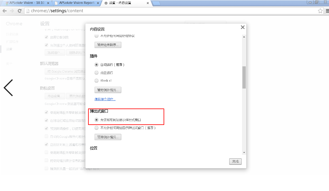 3、 將站點加入Java例外站點,同時在GoogleChrome設(shè)置-內(nèi)容設(shè)置-隱私設(shè)置中彈出式窗口改為允許或者添加例外:
