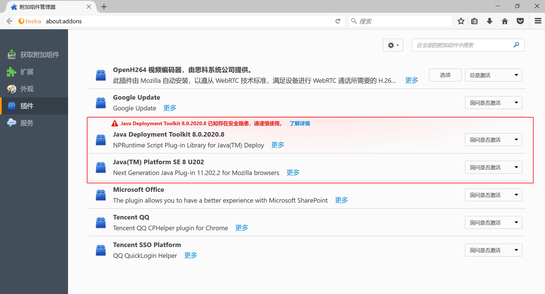 2、 安裝32位Firefox51.0,打開Firefox工具-附加組件管理器-插件,確認Java插件是否存在: