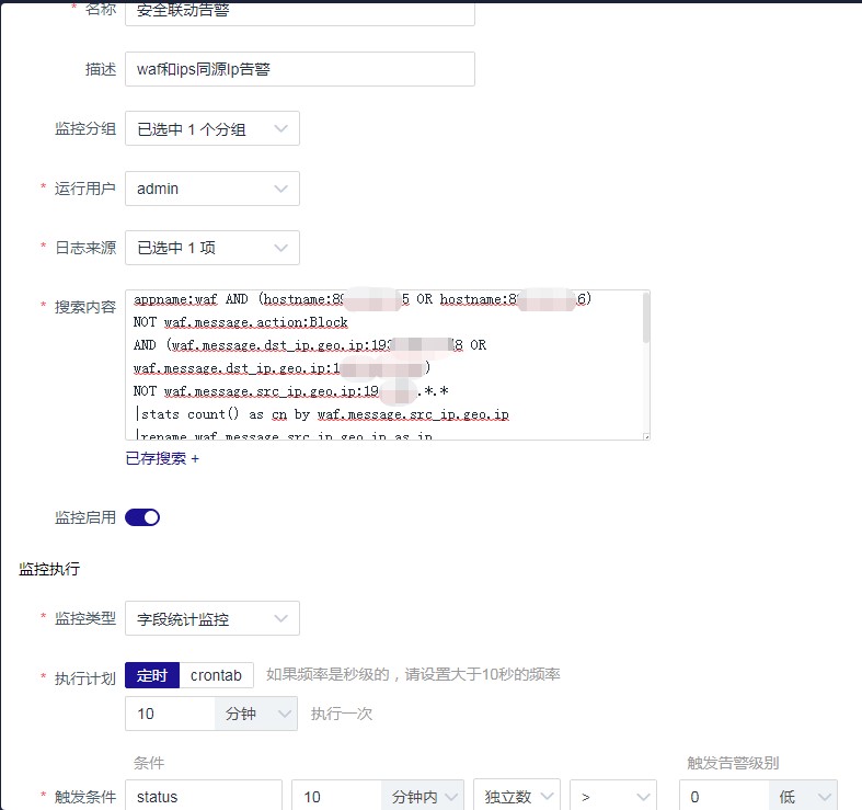 針對(duì)有可疑攻擊的安全事件,可指定時(shí)間,指定多臺(tái)安全設(shè)備顯示同一攻擊源IP的安全事件,對(duì)于相關(guān)源IP進(jìn)行告警,能有效排除誤報(bào),確認(rèn)為真實(shí)攻擊。此番操作要求為同一區(qū)域內(nèi)的相關(guān)設(shè)備,另外還要排除客戶給出的可信地址,然后對(duì)各設(shè)備的可疑源地址進(jìn)行匹配。
