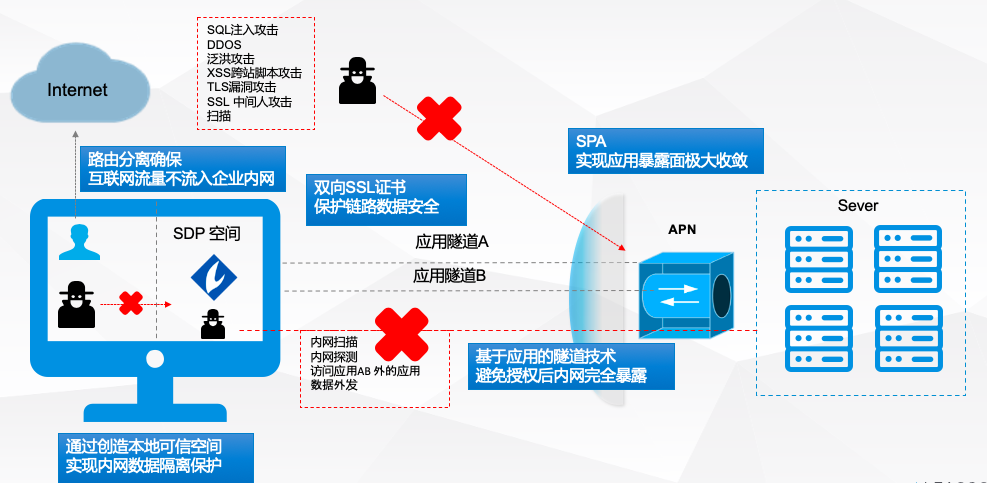SDP架構(gòu)隱藏核心網(wǎng)絡(luò)資產(chǎn)與設(shè)施,使之不直接暴露在互聯(lián)網(wǎng)下,使得網(wǎng)絡(luò)資產(chǎn)與設(shè)施免受外來(lái)安全威脅。