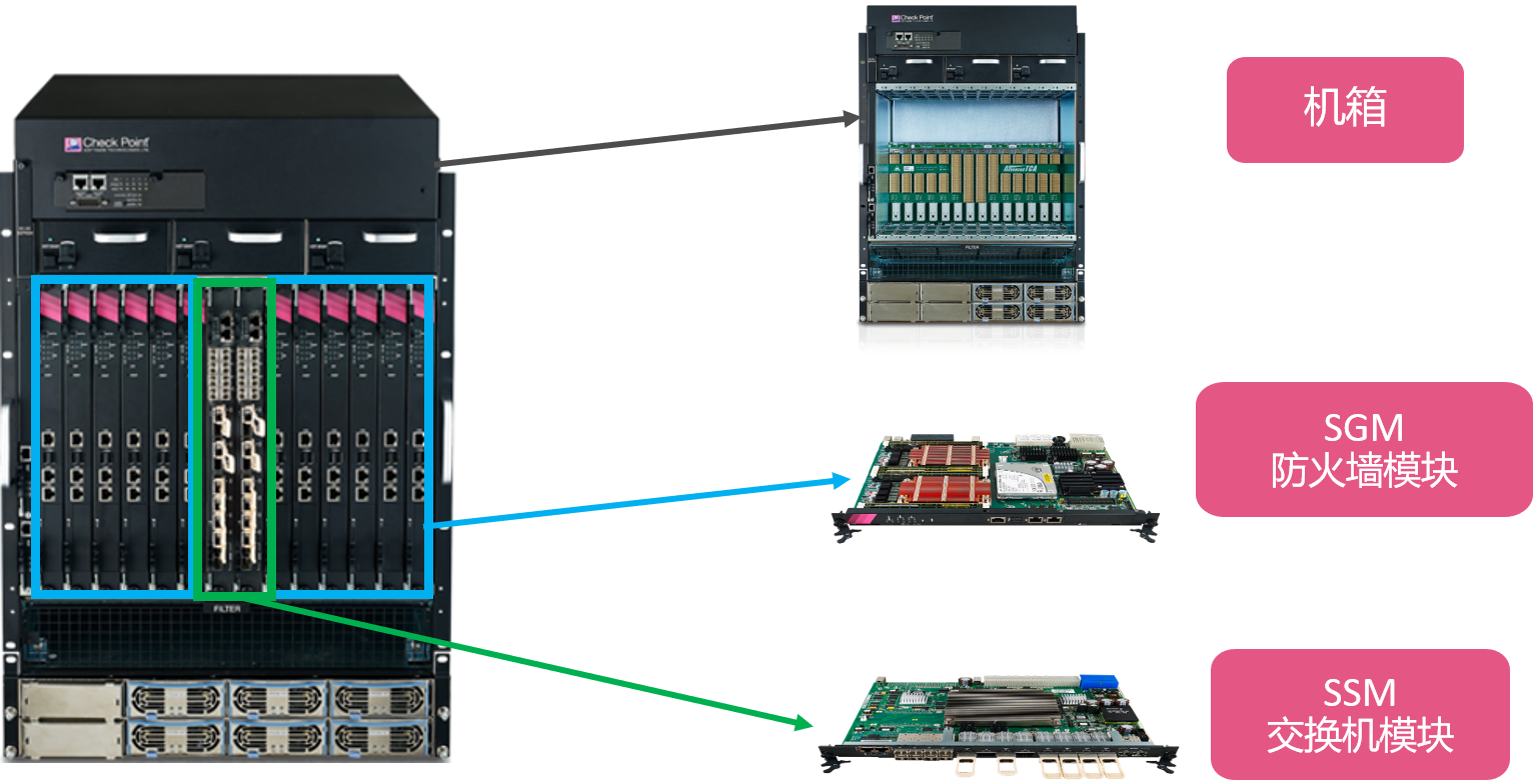 設(shè)備由1個(gè)機(jī)箱、若干SGM防火墻模塊和SSM交換機(jī)模塊組成。